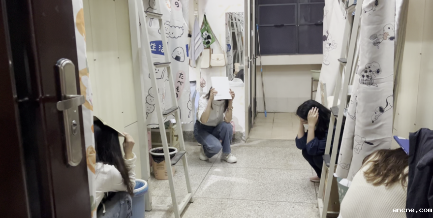 避险警报信号响起,学生按照避险要领迅速打开宿舍门,就近蹲在桌椅、床铺金属支撑架旁,并用抱枕等物品保护好头颈,保持避险状态。