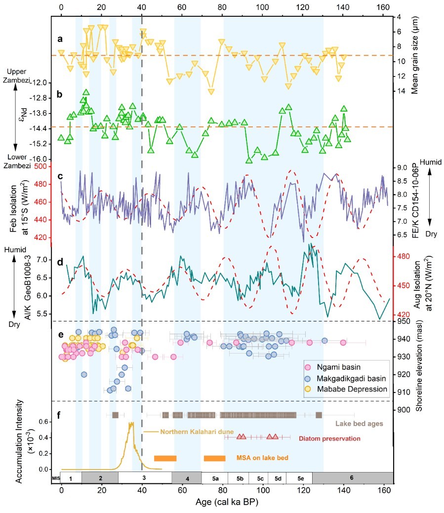 该研究系统采集了赞比西河口来自IODP,U1477站点的68个沉积物样品(图1)。通过整合之前发表的赞比西河干支流数据,利用Sr、Nd和Hf同位素数据以及REE分析对过去15万年的沉积物物源进行了系统研究。对赞比西河河口沉积物68个岩芯样品的多指标分析重建了人类活动干扰前的河流物质输送历史,结果表明,近15万以来,整个赞比西河流域均向赞比西河河口附近海域贡献了沉积物。明显的非放射性成因的εNd和εHf特征与放射性成因的87Sr/86Sr值反映了赞比西河流域中下游的沉积物输入。相反,明显的放射性成因的εNd和εHf特征以及非放射性成因的87Sr/86Sr值表明沉积物主要来自上游。上述地球化学和同位素数据的阶段性变化特征表明,赞比西河在晚更新世沉积物物源发生了重大变化(图2)。通过将我们的发现与其他来自海洋沉积物和古湖泊岩心的古气候记录对比研究,推断赞比西河上游沉积物来源对近海沉积物的贡献从大约4万年前开始增加,在此之前则主要来自中下游。此外,REE配分模式、Nd-Hf同位素耦合关系及粒度-物源解耦分析共同验证了物源转变的真实性。进一步分析其驱动机制,发现上述物源变化受到该地区构造与气候的协同作用的影响,即在4万年之前为构造主导期,乔贝断层(Chobe Fault)抬升阻塞上游河道,导致古大湖Makgadikgadi维持945米高湖面(图3),阻断了上游沉积物向河口输送。4万年之后为气候主导期,区域降水增加(图2)与断层活动减弱共同促使河道重新贯通,上游沉积物恢复输送,同时上游古湖泊萎缩为次级湖泊群(图3)。