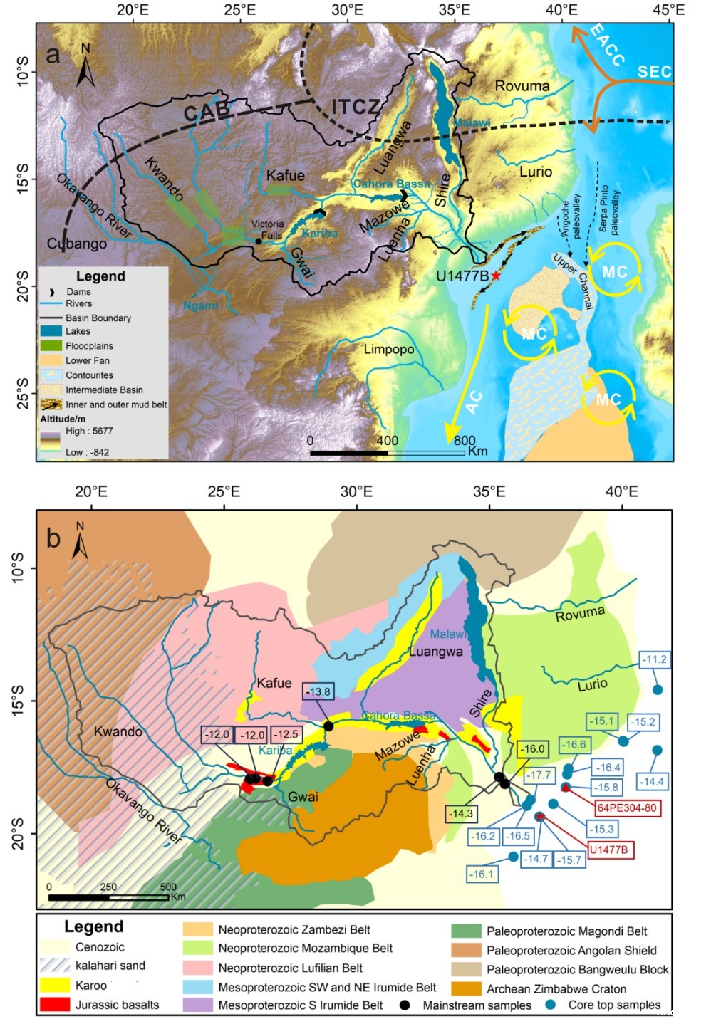 近日,米兰国际官网张虎才教授团队通过对国际大洋发现计划(IODP)位于赞比西河口的U1477站点的沉积物研究,首次系统重建了赞比西河流域过去15万年的沉积物来源变迁史,揭示了构造活动与气候变化对非洲第四纪河流演化的协同驱动机制。该成果以“Provenance analysis of Late Pleistocene sediment from IODP Site U1477 reveals climate and river basin dynamics in the Zambezi River catchment”(对国际大洋发现计划(IODP)U1477 站点晚更新世沉积物的物源分析揭示的赞比西河流域气候及河盆动力变化)为题在线发表于国际权威期刊Gondwana Research(中科院1区Top, IF=7.2)。该研究为赞比西河流域晚更新世的演化提供了新的视角,并强调了沉积物物源分析对准确重建区域气候和环境变化的重要意义。