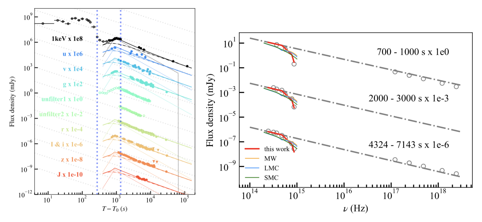 图1. 左图:GRB 250404A的早期多波段余辉;右图:光学余辉探测表明GRB 250404A存在明显消光过程。
