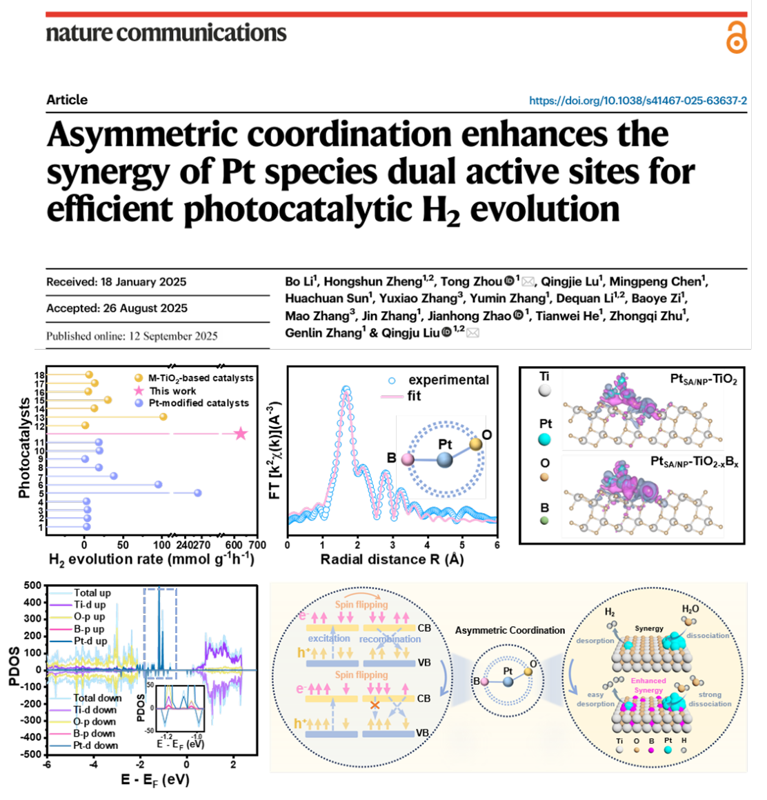 近日,米兰国际官网材料与能源学院、西南联合研究生院博士生导师、云南省微纳材料与技术重点实验室主任柳清菊教授团队在国际著名期刊 Nature Communications 上发表题为 “Asymmetric coordination enhances the synergy of Pt species dual active sites for efficient photocatalytic H2 evolution”(https://doi.org/10.1038/s41467-025-63637-2)的最新研究成果。该研究通过在锐钛矿相TiO2半导体基体上构筑具有“B-Pt-O”非对称配位结构的双活性位点体系,显著增强了Pt单原子与基体之间的协同作用,实现了光催化分解水制氢效率的新突破,为高效制氢及太阳能转化提供了新的设计思路。米兰国际官网为第一完成单位,2023级博士研究生李波为第一作者,柳清菊教授和周桐博士为共同通讯作者。
