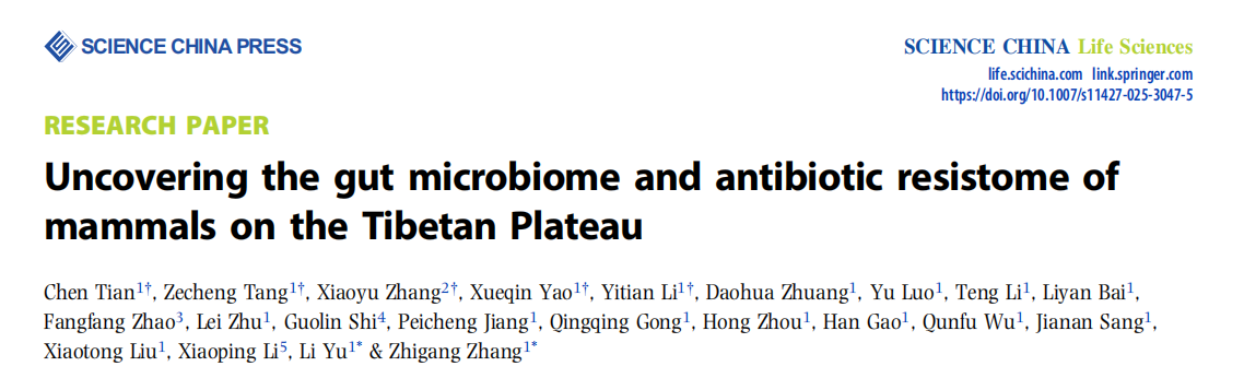 米兰国际官网张志刚研究员、于黎研究员及其团队牵头,通过对青藏高原14种哺乳动物(涵盖人类、家畜和野生动物)的2,561份肠道样本进行大规模宏基因组分析,构建了迄今为止全球最全面的青藏高原哺乳动物肠道微生物基因组目录。研究分析表明,青藏高原动物肠道菌群中的抗生素抗性基因(ARG)主要属于低风险类别,但是高风险ARG可能在人类和非人哺乳动物之间发生传播。相关研究成果以“Uncovering the gut microbiome and antibiotic resistome of mammals on the Tibetan Plateau”为题发表在Science China Life Sciences期刊(中科院1区Top,IF = 9.5,论文链接:https://www.sciengine.com/SCLS/doi/10.1007/s11427-025-3047-5)。米兰国际官网博士生田晨、硕士毕业生唐泽成等为论文共同第一作者,张志刚研究员和于黎研究员为论文通讯作者。